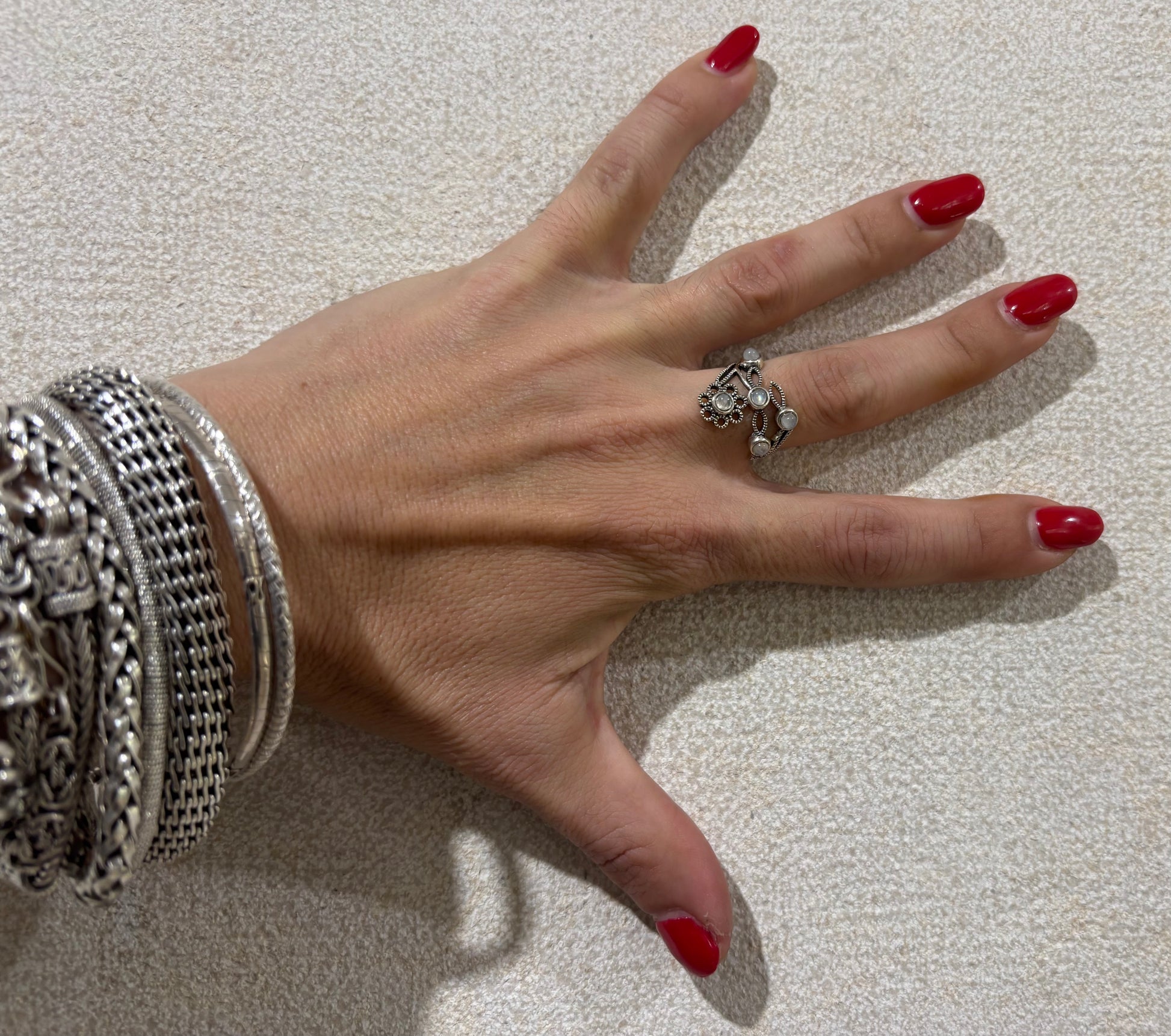 Un gioiello dal fascino etereo il nostro anello in argento 925 interamente lavorato a mano e impreziosito da pietre di luna, incastonate in un delicato intreccio di dettagli floreali e foglie cesellate.