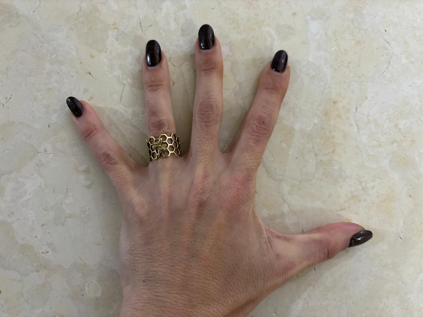 Anello in ottone dal design caratterizzato da una fascia traforata a motivo nido d’ape, leggera e ariosa, che lascia intravedere la pelle creando un raffinato gioco di trasparenze. Al centro, appesa a uno dei trafori, si trova una piccola ape piatta: un charm delicatamente inciso nei dettagli, che sembra svolazzare grazie al suo movimento naturale e discreto.