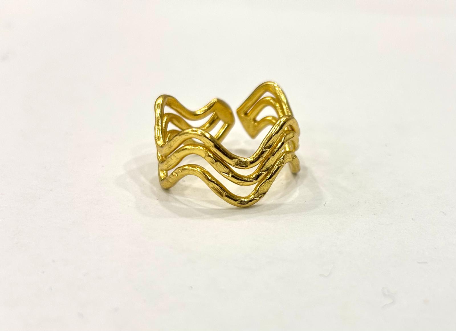 Tre sottili fili martellati, dall’andamento morbido e ondulato creano una fascia dal carattere dinamico e organico; sono saldate sul retro così da unirsi in un’unica struttura, lasciando la parte frontale ariosa. L’apertura sul fondo ne consente una regolazione confortevole, adattandosi con naturalezza alla circonferenza del dito. Un gioiello leggero e scultoreo, capace di donare luminosità e un’eleganza essenziale.