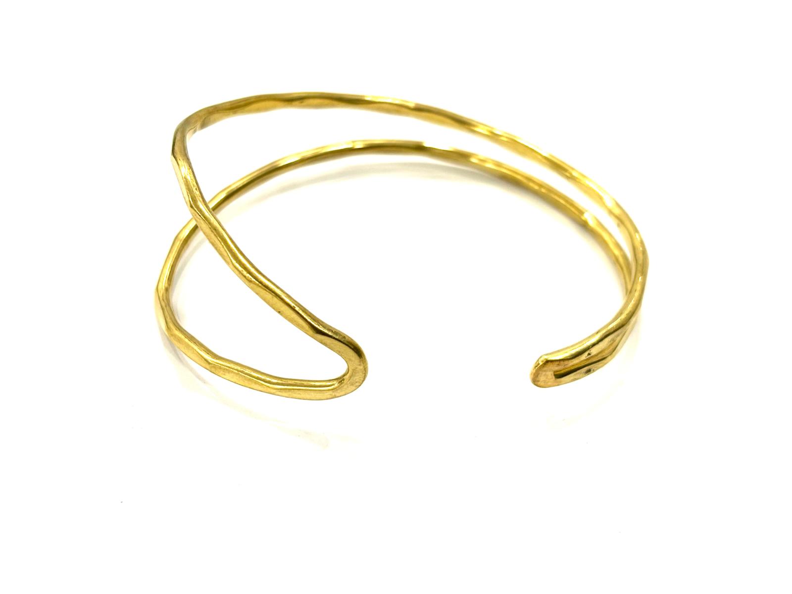 Un design aperto e scultoreo, realizzato con due fili martellati che si uniscono creando una linea sinuosa ed essenziale. Le superfici irregolari e martellate catturano la luce con eleganza, donando un carattere moderno e organico, mentre la struttura aperta rende il bracciale facilmente adattabile al polso e confortevole da indossare.
