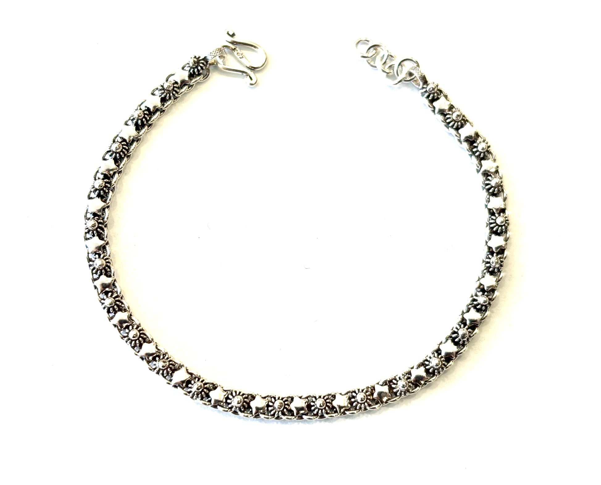 Questo elegante Bracciale piatto in argento 925 è impreziosito da un raffinato motivo di Fiori Sardi e stelle alternate, che crea un design armonioso e ricco di simbolismo.