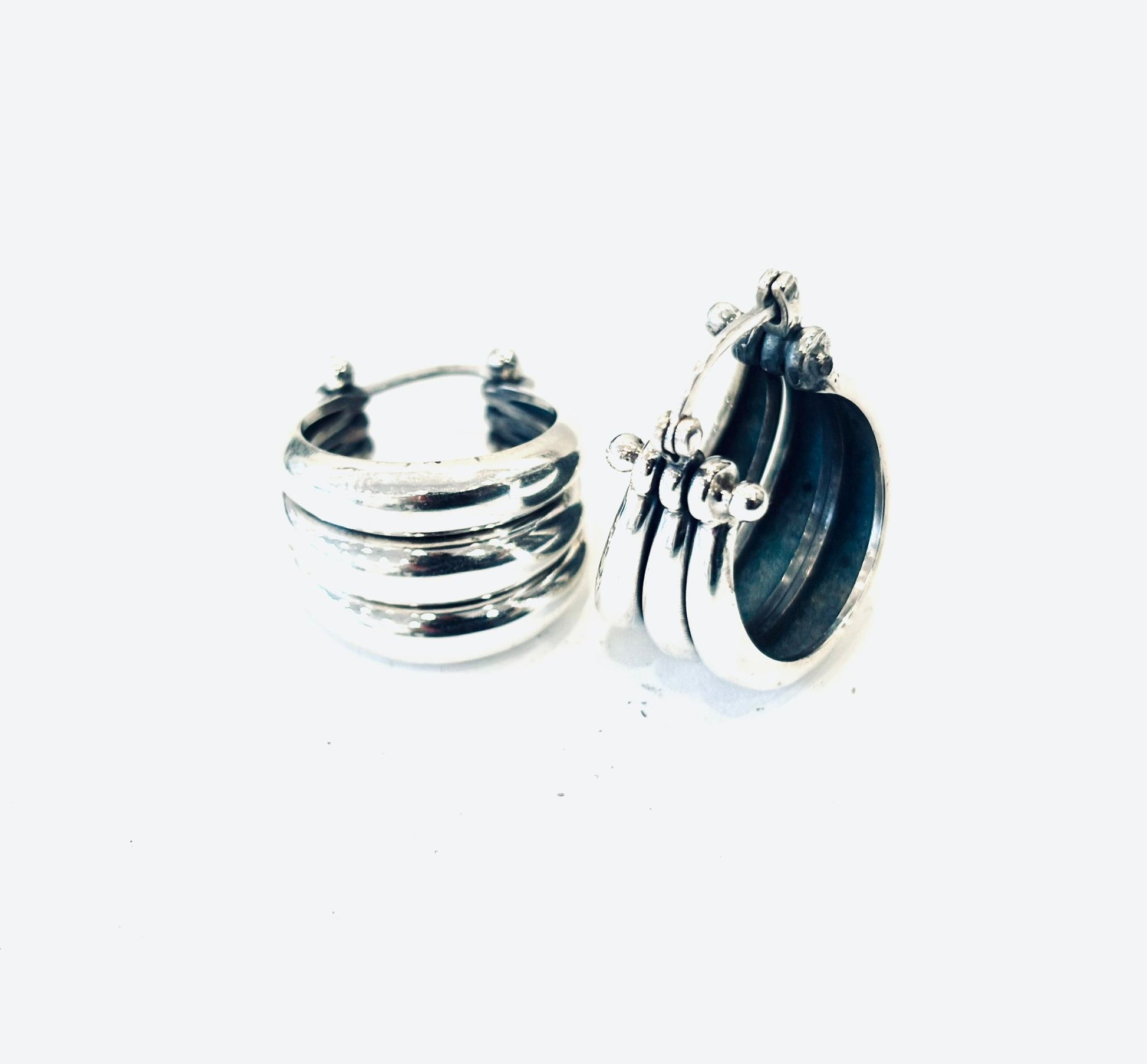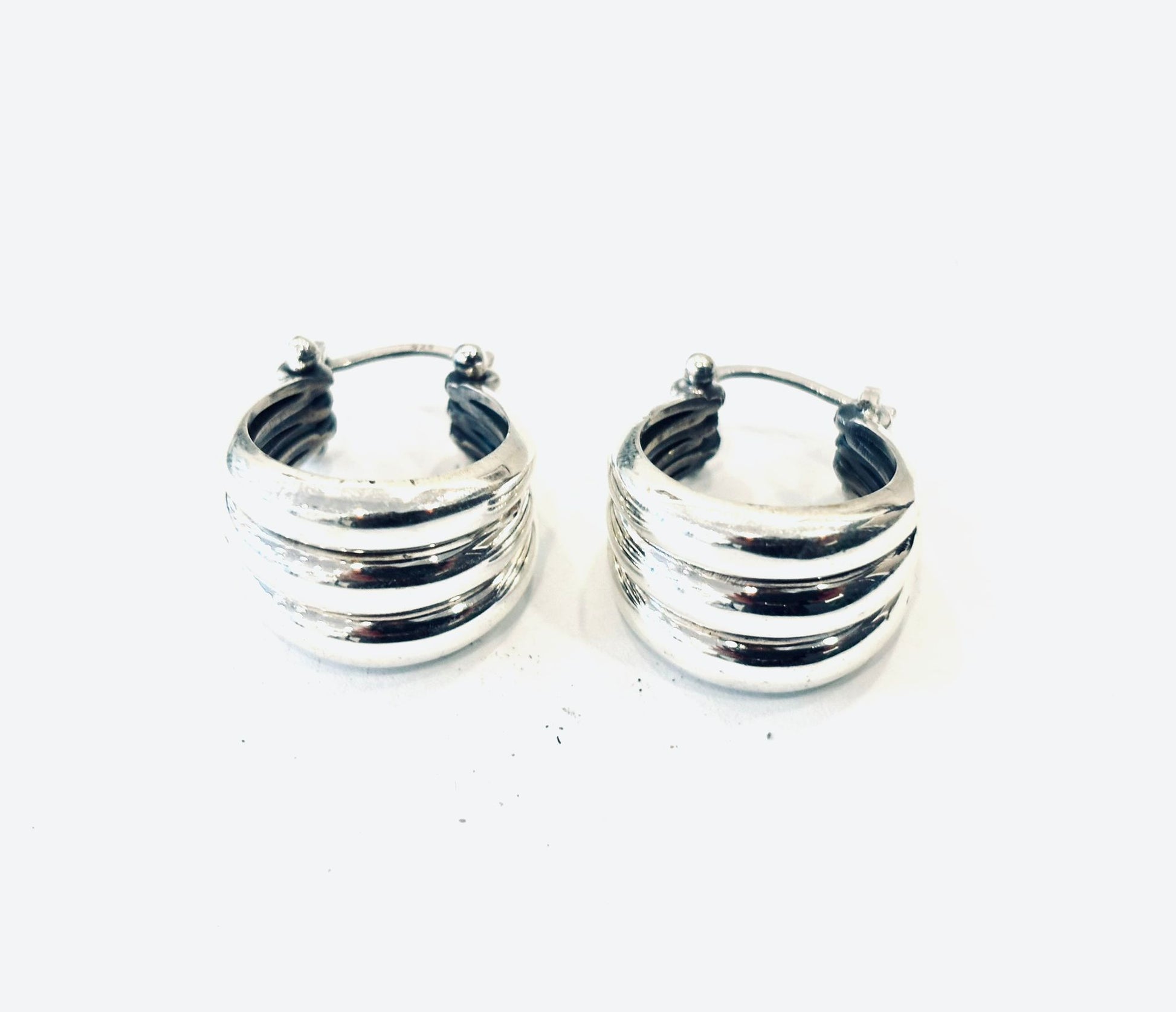Eleganti cerchi in Argento 925 con il loro particolare design a tre fasce, un gioco di volumi che li rende moderni e al tempo stesso ricchi di personalità. Un modello che unisce la tradizione dell’oreficeria artigianale a linee decise e sofisticate.