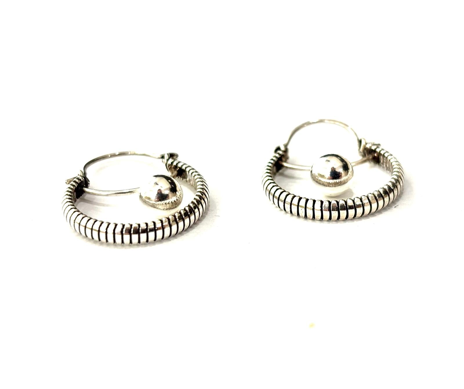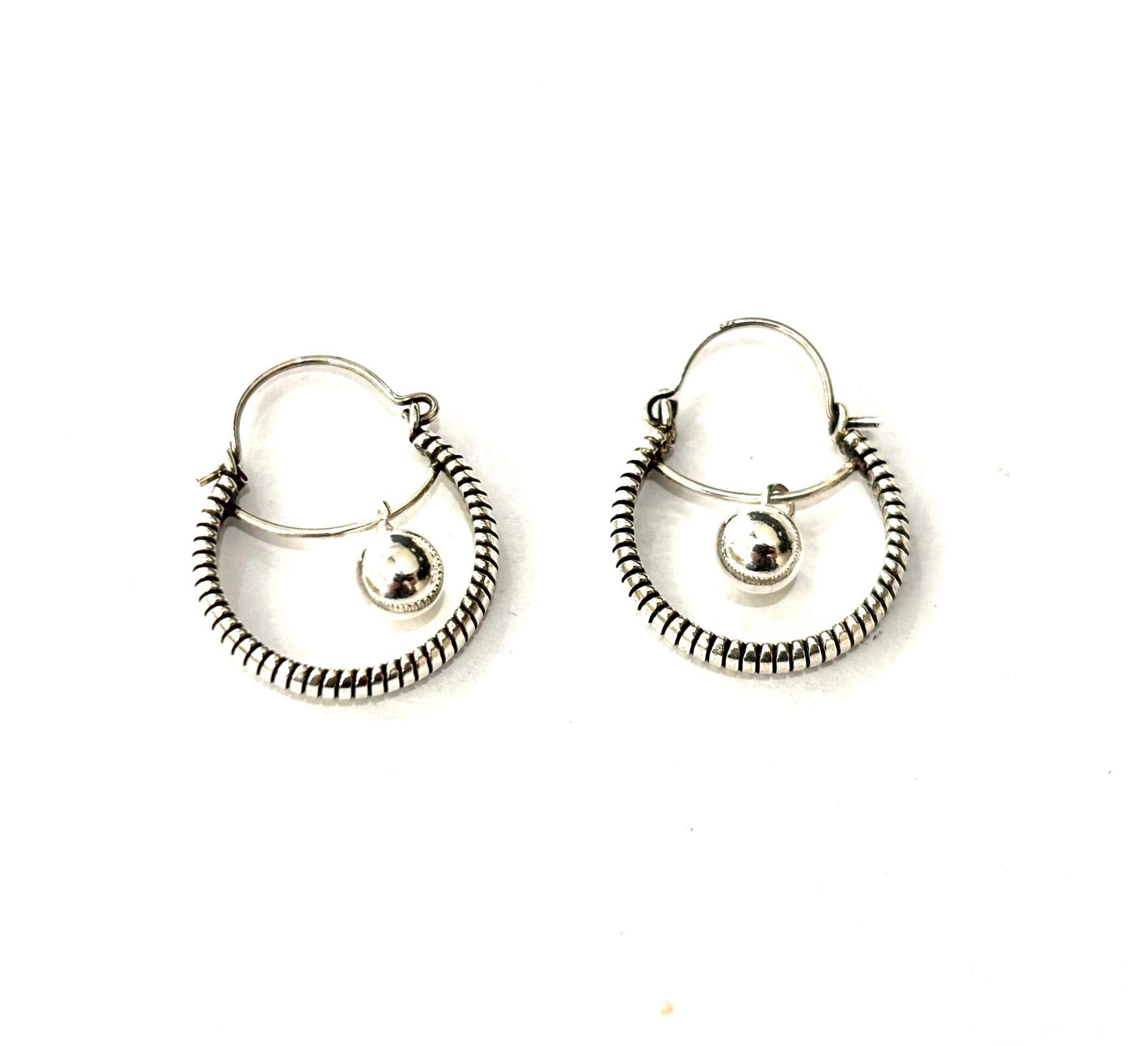 Orecchini in argento 925 dal fascino etnico e raffinato, caratterizzati da una sottile lavorazione a righe che abbraccia una piccola sfera pendente, libera di oscillare ad ogni movimento.