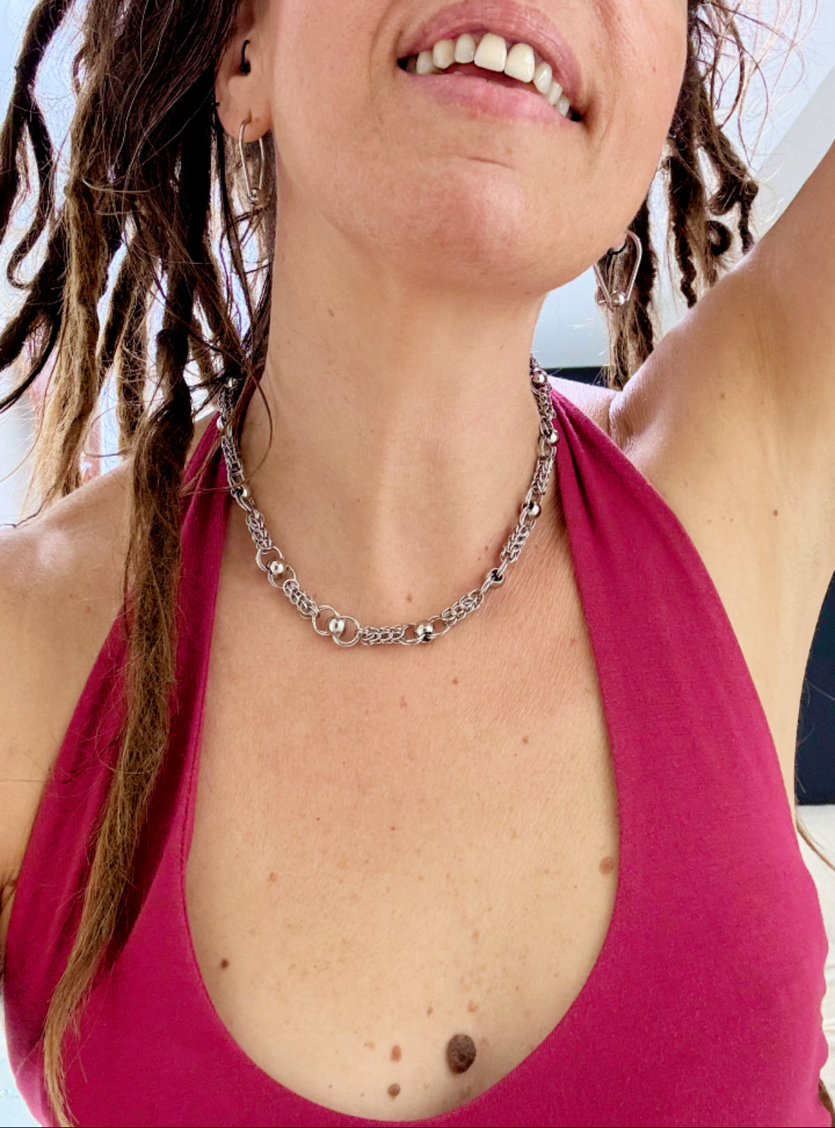 Il nostro girocollo Karamiau in acciaio è un esempio di lavorazione artigianale raffinato e dal carattere deciso. La trama è realizzata con maglia persiana tonda, arricchita da contromaglie dal diametro di 1 cm e sfere centrali da 8 mm, che creano un equilibrio perfetto tra robustezza ed eleganza.