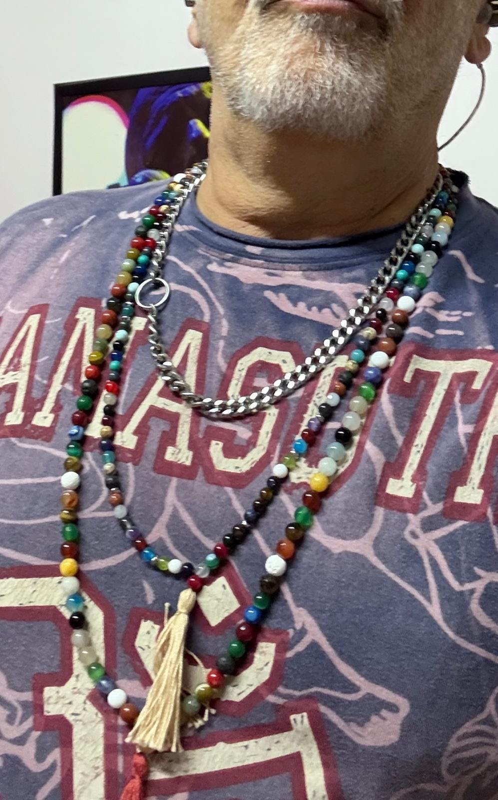 Questo modello, più lungo e ancora più scenografico, mantiene la stessa qualità eccellente delle pietre: ogni grano è unico, con venature naturali, colori profondi e una bella energia al tatto. L’alternanza tra perle, inserti metallici e la nappa pendente crea un equilibrio perfetto tra spiritualità e stile.