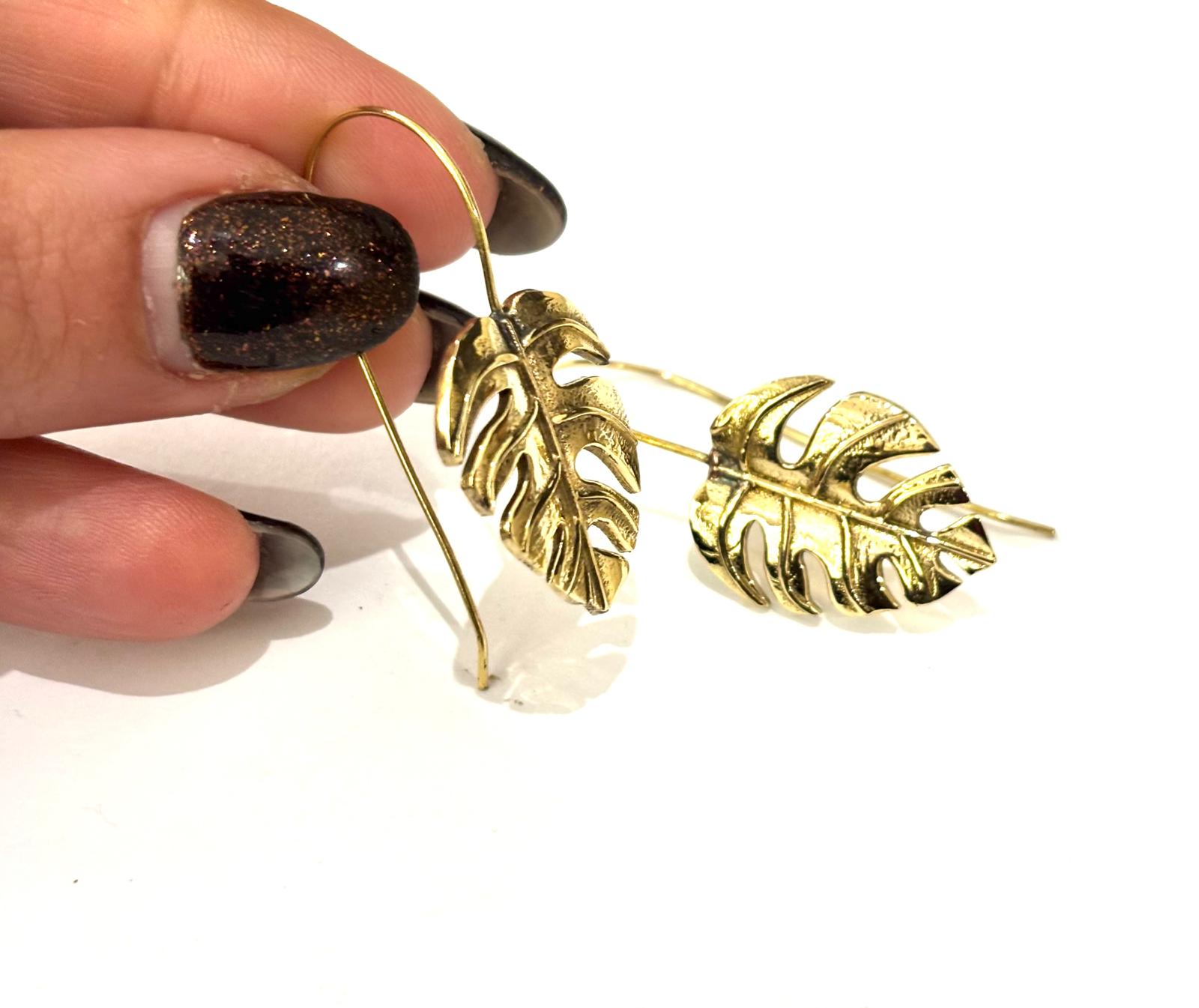 Dalla parte superiore della foglia parte un sottile filo in ottone, modellato in forma di uncino, pensato per inserirsi direttamente nel lobo. La linea è essenziale, pulita, e la foglia rimane ferma nella posizione frontale senza oscillare, creando un effetto grafico deciso e molto elegante.