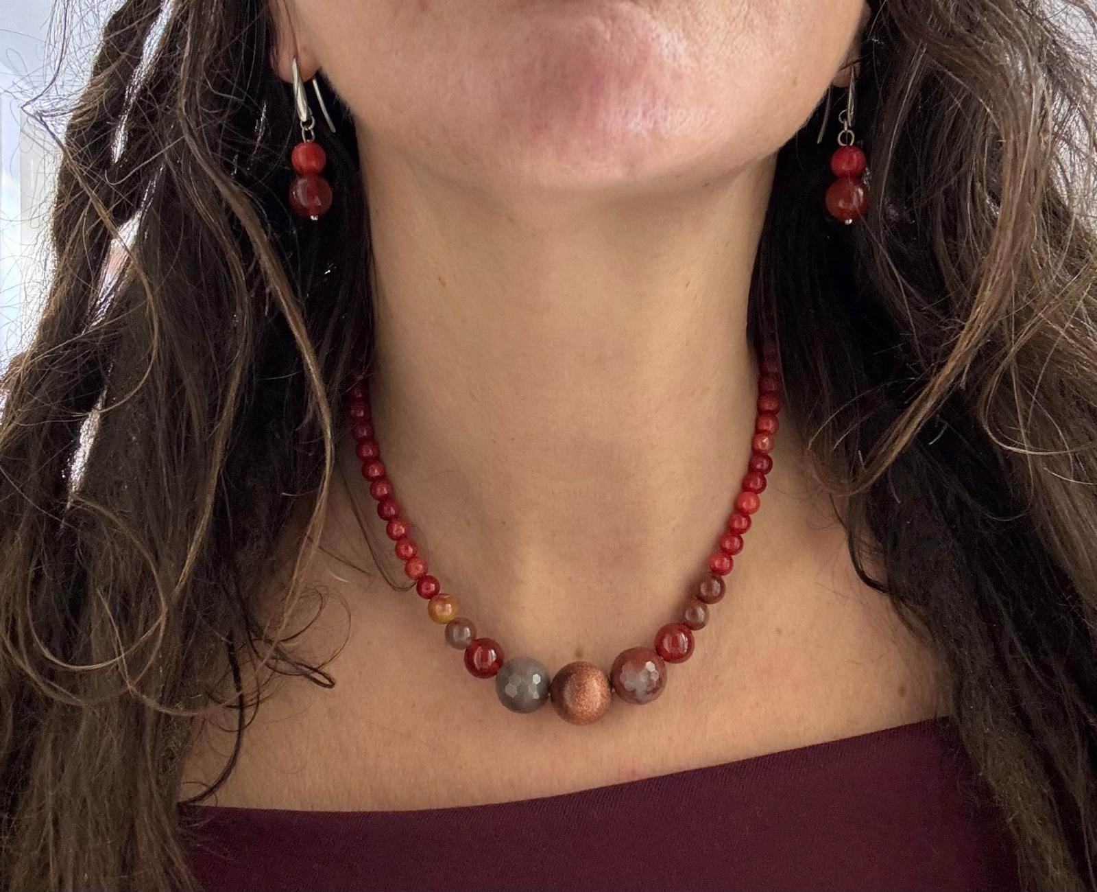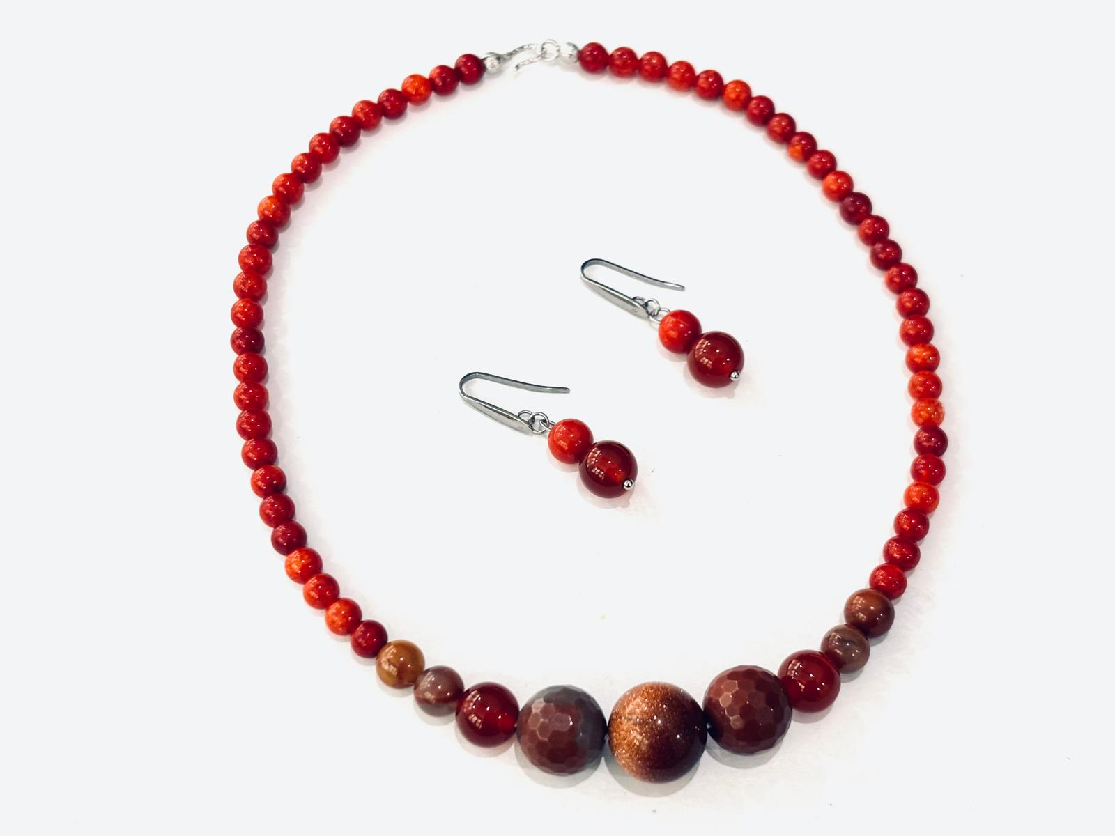 Un’esplosione di energia vitale e fascino naturale: questa parure artigianale composta da girocollo e orecchini coordinati è realizzata interamente a mano nel nostro laboratorio, con pietre naturali scelte per le loro vibrazioni calde e positive.